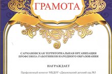 Профсоюзная организация МБДОУ№3 “Алёнушка ” была удостоена Грамотой Сармановской территориальной организации профсоюза работников народного образования. Поздравляем нашего профсоюзного лидера Халитову Наилю Амирзановну и желаем ей успехов в дальнейшей работе! 08.10.2019