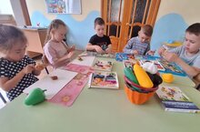 Цель: продолжать учить детей передавать форму и характерную особенность овощей с помощью приемов: раскатывание, расплющивание, вдавливание;учить достижению выразительности через более точную передачу формы, величины предметов у овощей. -