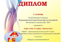 Старший воспитатель Хайруллина Зульфира Франысовна участвовала в Республиканском конкурсе "Безопасность глазами детей " в номинации "Конкурс уголков по безопасности" и была награждена дипломом I степени.