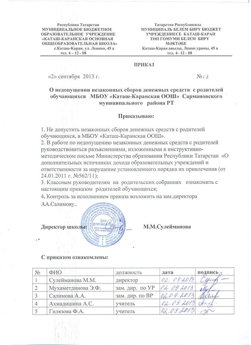Приказ о недопущении незаконных сборов денежных средств 2013 г.