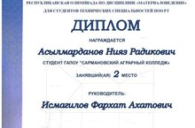 Обучающийся ГАПОУ «Сармановский аграрный колледж» Асылмарданов Нияз Радикович занял 2 место в Республиканской олимпиаде по дисциплине «Материаловедение» среди студентов технических специальностей ПОО РТ.