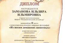 Воспитанник старшей группы Заманова И награждена дипломом за участие в международном конкурсе цифровых фотографий "Из жизни домашних животных". 10.02.2021