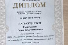 Ученица 7 класса МБОУ "Альметьевская СОШ им.М.Рамзи' Галяутдинова Самия (учитель Валиев Руслан Радифович) стала призером республиканской олимпиады по арабскому языку. На республиканском этапе Самия соревновалась среди учащихся 9 классов. Молодцы. Поздравляем.