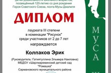 Эрик участвовал в Республиканском патриотическом конкурсе "Красная ромашка"посвященный 120-летию со дня рождения Героя Советского Союза поэта Муса Джалиля,награжден дипломом лауреата III степени. Поздравляем!