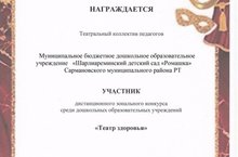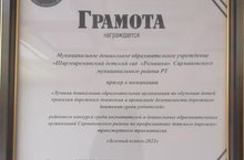 По итогам муниципального этапа конкурса "Зеленый огонек-2022" стали призером в номинации "Лучшая дошкольная образовательная организация по обучению детей правилам дорожного движения и пропаганде по безопасности дорожного движения среди родителей" районного конкурса среди воспитателей и дошкольных образовательных организаций Сармановского района по профилактике детского дорожно-транспортного травматизма "Зеленый огонек-2022"