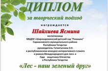 Шайхиева Ясмина,воспитанница детского сада МБДОУ “Шарлиареминский детский сад “Ромашка”,победила в республиканском конкурсе интерактивного плаката в рамках Международного дня леса и Года защитника Отечества в Республике Татарстан “Лес-наш зеленый друг”.