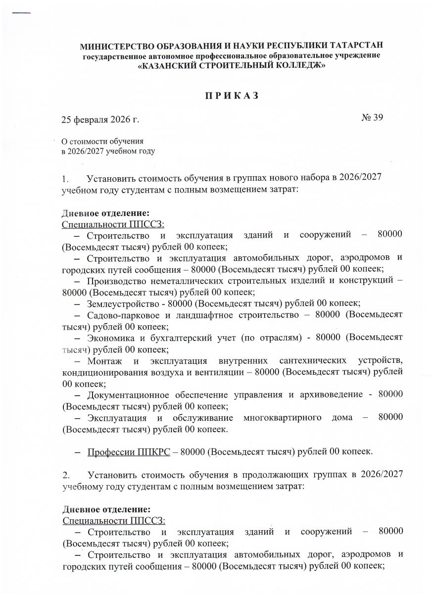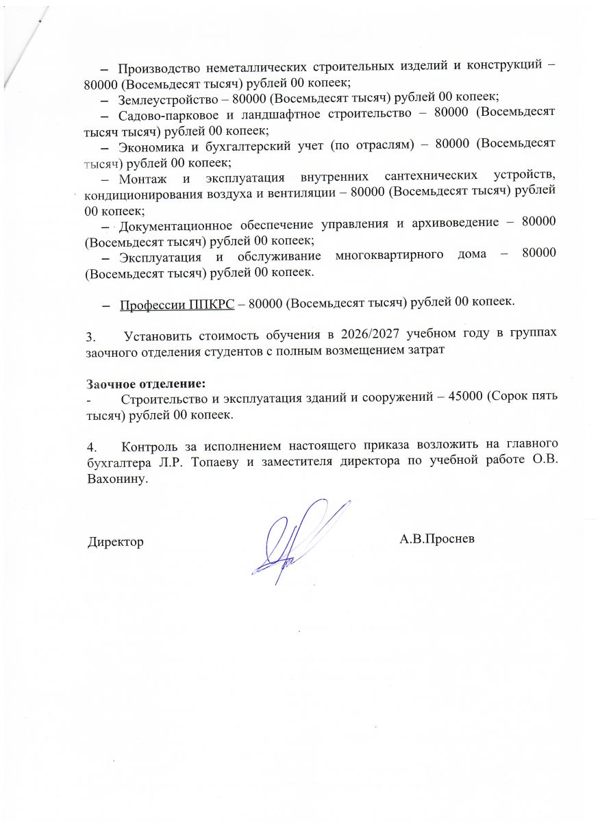 Приказ о стоимости обучения 2 лист