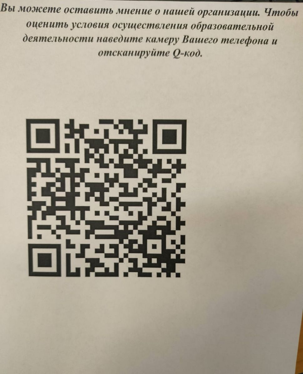 Вы можете оставить мнение о нашей организации. Чтобы оценить условия осуществления образовательной деятельности наведите камеру Вашего телефона и отсканируйте Q-код.