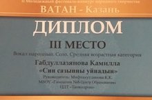 Поздравляем ученицу 6Г класса Габдуллазянову Камиллу (рук. Мифтахутдинова К.К.) с почётным 3 местом во II Молодёжном фестивале-конкурсе народного творчества "Ватан- Казань". Желаем ей удачи на Республиканском этапе конкурса.