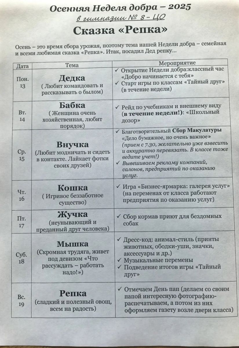 Добро в каждом доме: в нашей гимназии стартовала Осенняя неделя добра! Это прекрасная возможность проявить заботу, внимание и поддержку друг к другу и тем, кто в этом нуждается. В течение этой недели мы будем проводить различные мероприятия, направленные на воспитание доброты, милосердия и активной гражданской позиции. Присоединяйтесь к нам, чтобы сделать мир вокруг чуточку лучше! С графиком мероприятий Осенней неделе добра можно ознакомиться пройдя по ссылкеНеделя Добра