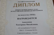 3 февраля 2017 года состоялся Региональный этап Всероссийской олимпиады школьников по МХК. Призером стала ученица 9Б класса Анисимова Екатерина. Учитель - Ахмерова Светлана Владимировна.
