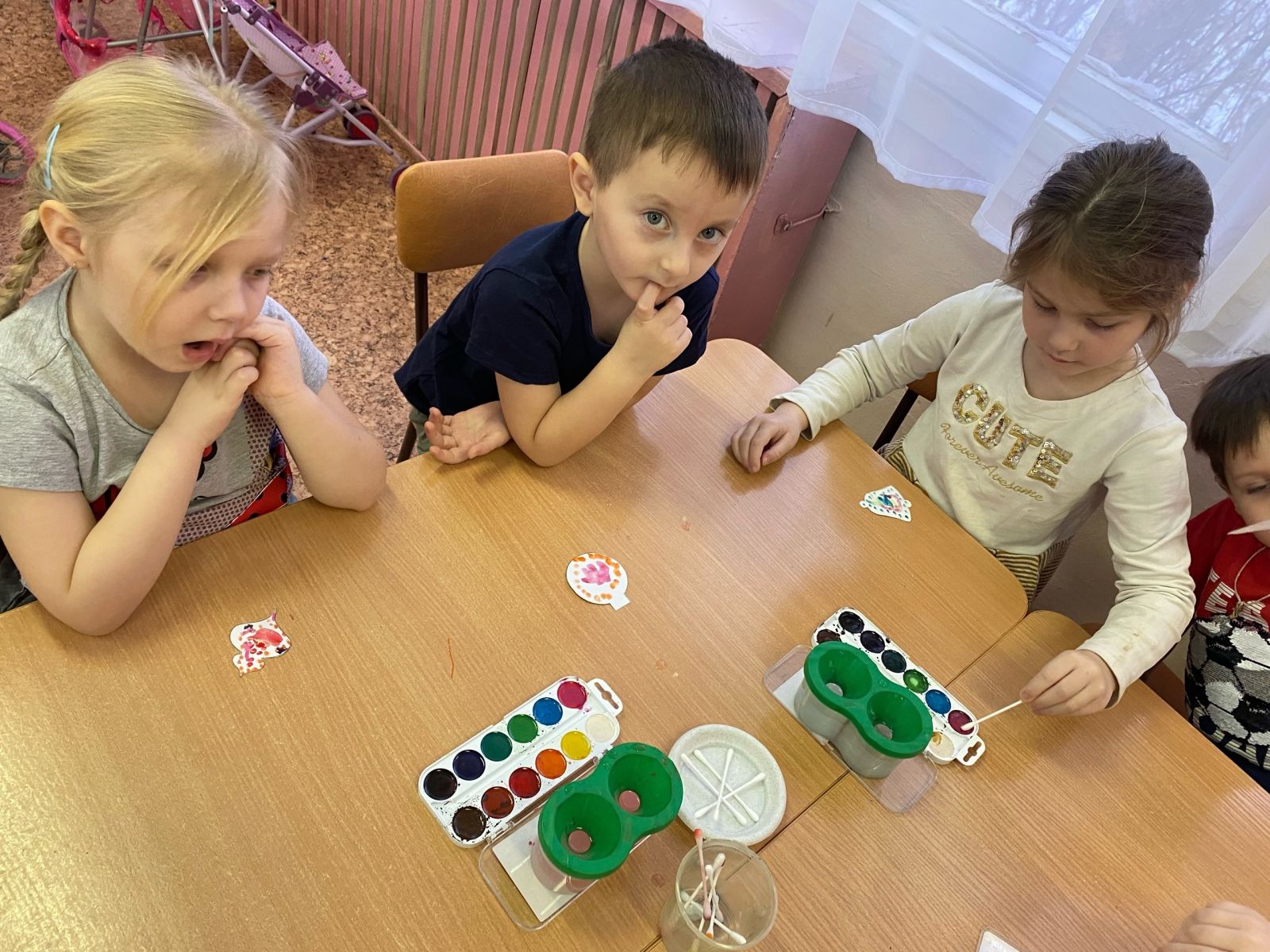 На занятии по аппликации, дети смастерили забавных бумажных снеговиков.