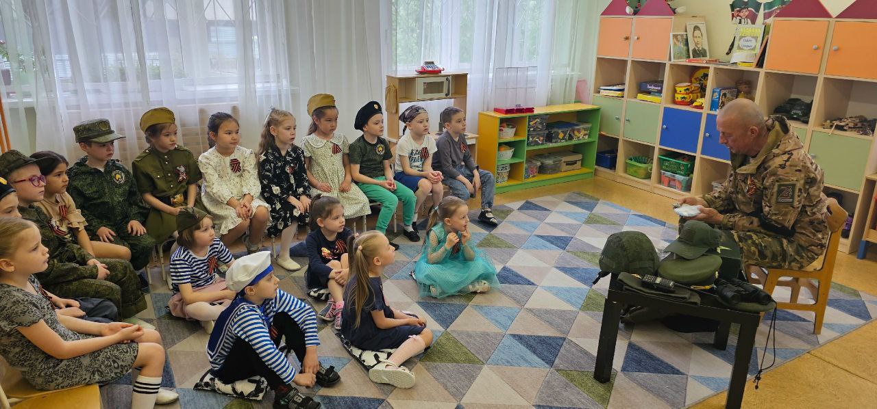 В честь праздника Победы и в честь всех защитников Отечества в гостях у детей подготовительной к школе группы был настоящий защитник Отечества - ветеран боевых действий, участник СВО Гарифуллин Рустам Мухаматханович, который еще является дедушкой нашей воспитанницы Рианны.