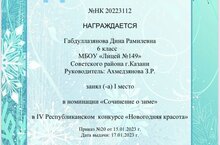 Ученица 6 класса Габдуллазянова Дина заняла 1 место в IV Республиканском конкурсе "Новогодняя красота" в номинации "Сочинение о зиме". Поздравляем нашу ученицу и её руководителей с победой!