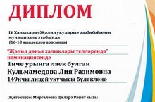 13 нче октябрьдә Казанда IV Халыкара «Җәлил укулары» әдәби бәйгесенең муниципаль этабы узды. Әдәби бәйге Бөтендөнья татар конгрессы тарафыннан ел саен уздырылып килә. Ул сөйләм үсеше һәм нәфис сүз белән кызыксыну, шигъри сүзнең матурлыгын һәм аһәңен тоя белү максатыннан үткәрелә. Муса Җәлил иҗатын төрле телләрдә яңгыраткан җиңүчеләр арасында безнең лицей укучылары булуы да сөендерде. Колмәмәдова Лия «Җәлил дөнья халыклары телендә» номинациясендә 1 урын, Хәйруллина Рузанна 2 нче урын яулады. Укучыларыбызны ихлас котлыйбыз, иҗади уңышлар телибез.