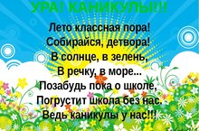 УРА!!!Каникулы!!! С 31 мая в нашей школе начал свою работу пришкольный лагерь.Режим работы: ПН-ПТ с 9.00-15.00 (дежурная группа с 8.00-16.00)