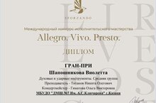 Победы нашей ученицы на международном конкурсе «AIIEGRO. VIVO. PRESTO» 09.02.2025