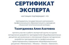 Из Республики Татарстан приняли участие несколько экспертов проверять работы со всей России. Алия Азатовна являлась экспертом РФ по оценке методических разработок преподавателей общеобразовательных дисциплин для включения в электронный сборник методических разработок преподавателей по профессионально ориентированному содержанию общеобразовательных дисциплин «Математика», «Физика», «Химия», «Биология», реализуемых в пределах освоения образовательных программ СПО по профессиям/специальностям. Получила Сертификат эксперта от Министерства Просвещения России, ИРПО.