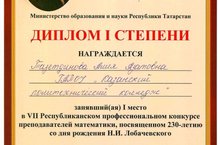 На базе ГАПОУ «Камский строительный колледж имени Е.Н. Батенчука» уже семь лет проходит Республиканский профессиональный конкурс преподавателей математики, посвященный 230-летию со дня рождения Н.И. Лобачевского. Преподаватель математики нашего колледжа Тазетдинова Алия Азатовна, пройдя все этапы конкурса завоевала 1 место! Поздравляем! Гордимся!