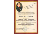 Во II Республиканском профессиональном конкурсе преподавателей математики, посвященном 225-летию со дня рождения Н. И. Лобачевского преподаватель математики Матвеева С.Г. награждена почетной грамотой победителя в номинации «За уважение к заслугам и памяти Н. И. Лобачевского». Желаем ей творческих успехов.