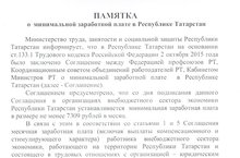 Согласно письма Министерства труда, занятости и социальной защиты РТ № 22-66/13514 от 28.10.2015 г. направлена ПАМЯТКА о минимальной заработной плате в РТ