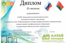 20.05.2023 елда безнең колледж укытучылары Воронцова Лия Геннадьевна, Худякова Анна Николаевна үзләренең 1620нче төркем студентлары Сәгъдиева Альбина һәм Фаткуллина Айгөл белән Урта һөнәри белем укучылары арасында "сөт җитештерү остасы" компетенциясе буенча VI Халыкара һөнәри осталык конкурсында катнаштылар һәм 2нче урынны алдылар. Котлыйбыз!