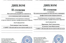 2023 елның 24 мартында "Урта һөнәри белем бирү педагогы осталыгы" республика методик конкурсында безнең укытучылар Таҗетдинова Алия Азатовна табигый-фәнни дисциплина буенча дәресне методик эшләү номинациясендә 2 дәрәҗә Диплом белән бүләкләнделәр, Воронцова Лия Геннадьевна һәм Худякова Анна Николаевна һөнәри юнәлештәге сыйныфтан тыш чараны эшләү номинациясендә 2 дәрәҗә Диплом белән бүләкләнделәр. Котлыйбыз!