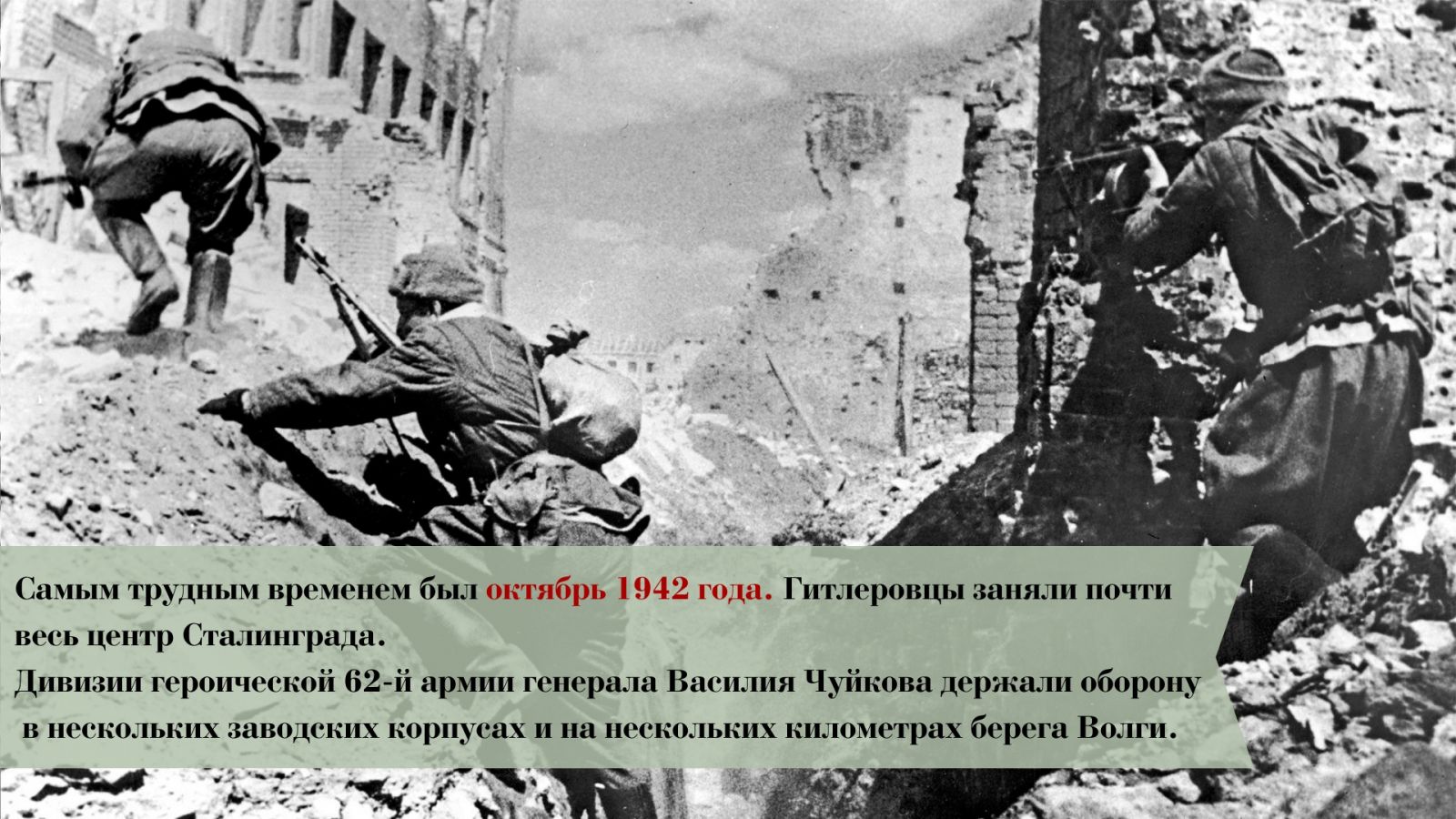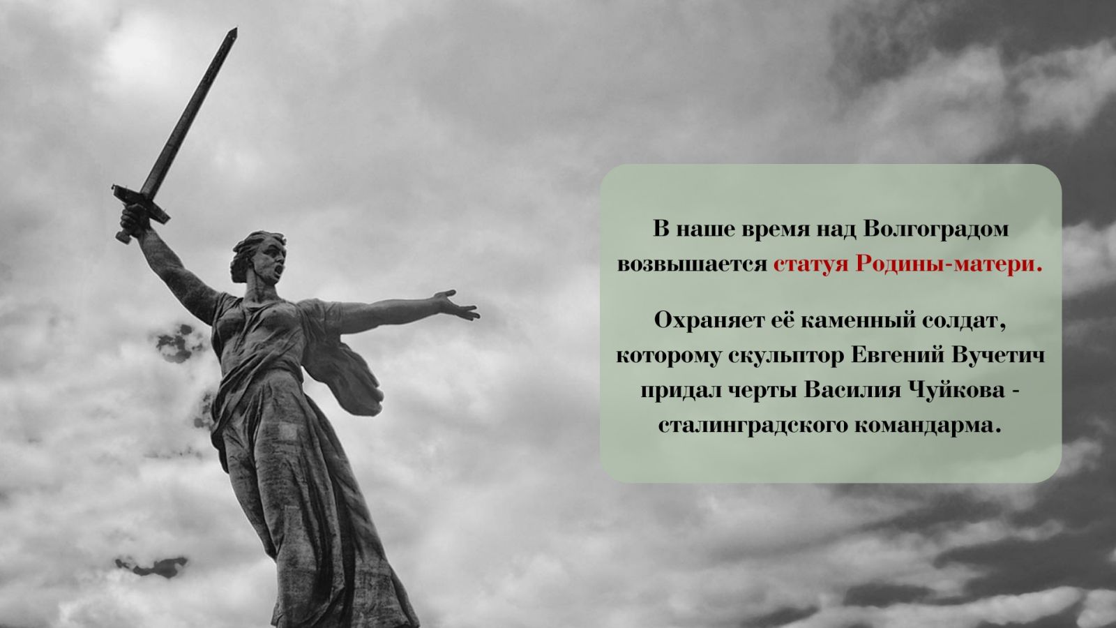 «Эх, Сталинград, Сталинград... Как часто о нём вспоминаешь! Об этом городе, стёртом на твоих глазах с лица земли и всё-таки оставшемся живым...» – восклицал писатель Виктор Некрасов – заместитель командира сапёрного батальона, защищавший Мамаев курган на протяжении всех «дней и ночей» великой битвы.