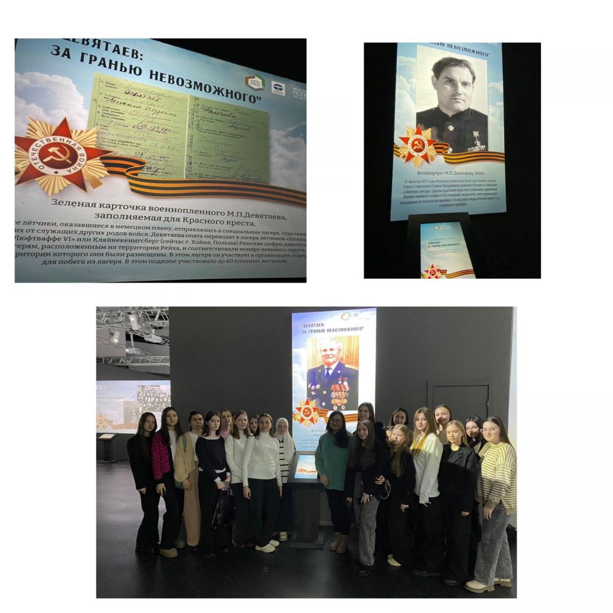 В рамках военно-патриотического месячника студенты 211 и 221 групп под руководством классных руководителей Каримовой И.А. и Нигматзяновой Г.В. 14 февраля 2024 г. посетили выставку «Девятаев: за гранью невозможного», которая проходила в Историческом парке «Россия -моя история». Выставка приурочена ко Дню памяти подвига М.П. Девятаева и его экипажа, совершившего побег на немецком бомбардировщике, а также отражает жизненный путь героя, который долгое время учился, жил и работал в г. Казань.
