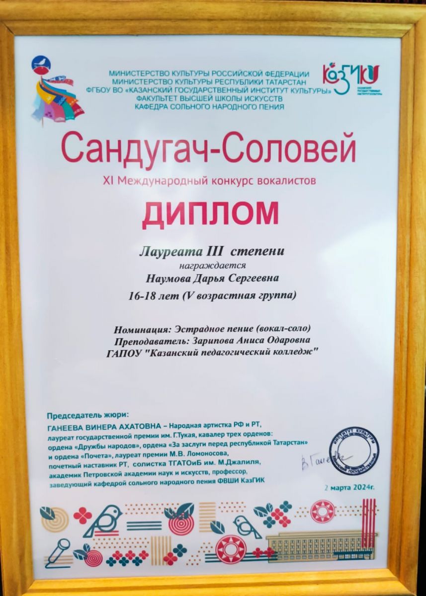 Опубликовано: 04.03.20242 марта состоялся XI Международный конкурс вокалистов "Сандугач - Соловей". Наша студентка, Наумова Дарья (213 гр.) стала лауреатом III степени в номинации