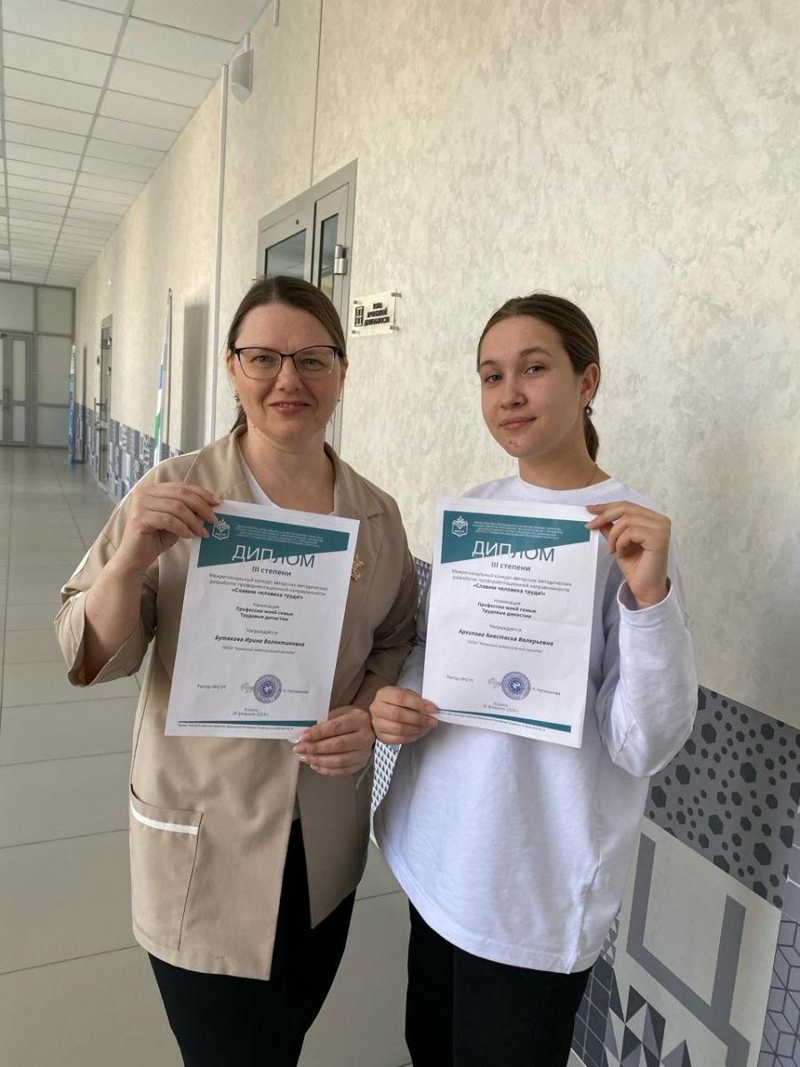 Подведены итоги конкурса: дипломом 3 степени в номинации "Профессии моей семьи. Трудовые династии" награждены Архипова Анастасия, 233 группа и её руководитель Бутякова Ирина Валентиновна.