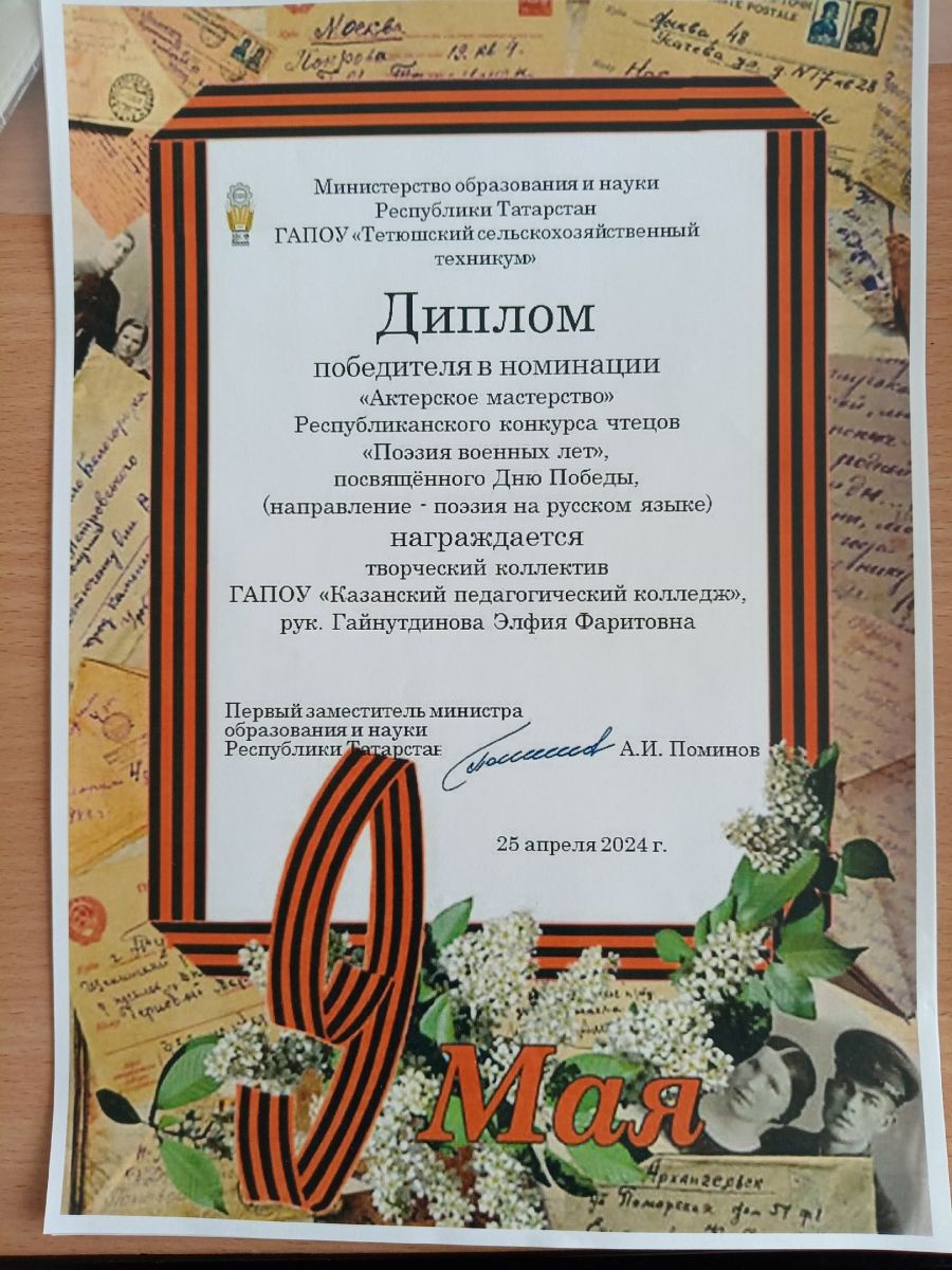 Студенты 911 группы Жига Даниил и Гаврилова Лейсан стали победителями Республиканского конкурса чтецов "Поэзия военных лет" в номинации "Актёрское мастерство". Подготовила студентов преподаватель Гайнудинова Э.Ф