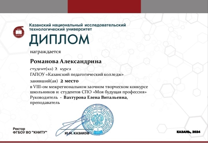 Студентка группы 323 Романова Александрина написала прекрасное стихотворение о своей будущей профессии и заняла 2 место в VIII межрегиональном творческом конкурсе «Моя будущая профессия», который проводил ФГБОУ ВПО «Казанский национальный исследовательский технологический университет». Подготовила студентку преподаватель Вахтурова Е.В.