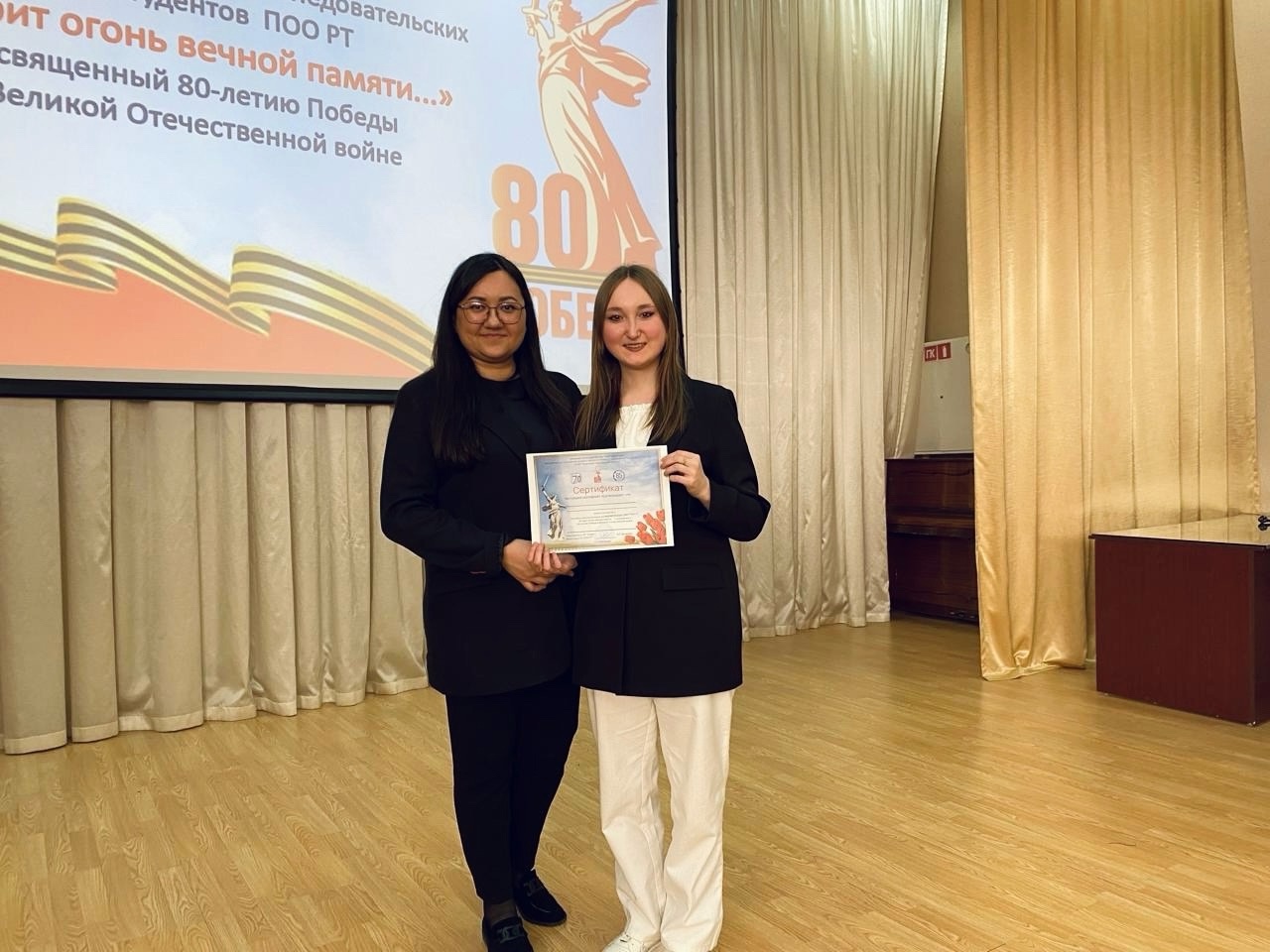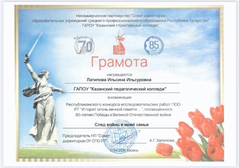 Опубликовано: 19.04.202517 апреля на базе ГАПОУ «Казанский строительный колледж» состоялся Республиканский конкурс исследовательских работ студентов ПОО РТ «И горит огонь вечной памяти…», посвященный 80-летию Победы в Великой Отечественной войне. В конкурсе было представлено более 50 работ. Студентка Латипова Ильсина из 322 группы под руководством преподавателя ОГСЭД Каримовой И.А. была награждена грамотой в номинации «След войны в моей семье».
