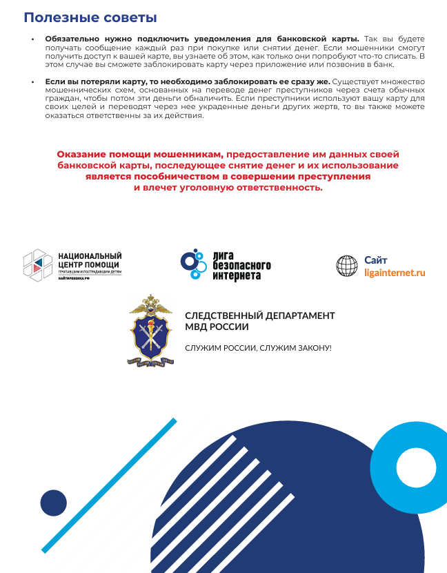 В рамках организации и проведения Единого урока использовались методические рекомендации и справочные материалы Ассоциации участников рынка интернет-индустрии противодействии «Лига безопасного интернета» , а также информационные материалы о финансовому мошенничеству с использованием информационно-телекоммуникационных технологий, разработанные Генеральной прокуратурой Российской Федерации: