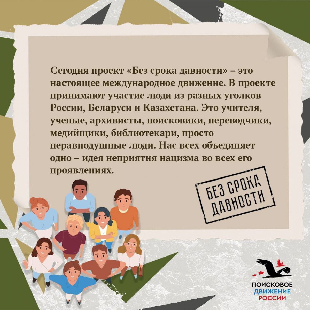 Международный конкурс сочинений «Без срока давности» – самый масштабный конкурс образовательно-просветительских мероприятий проекта, в прошлом году получил статус международного конкурса. Он является прямым продолжением Всероссийского конкурса сочинений «Без срока давности», который проводится с 2019 года.