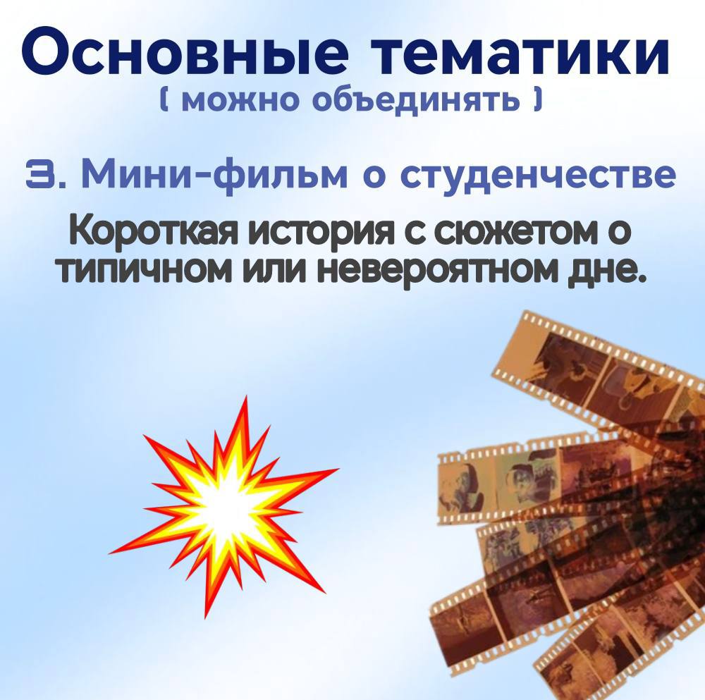 Покажи, что твоя стихия — не только сессии и лекции, но и драйв, энергия и безграничное творчество! Мы запускаем онлайн-флешмоб, где главные герои — ты и твоя студенческая жизнь