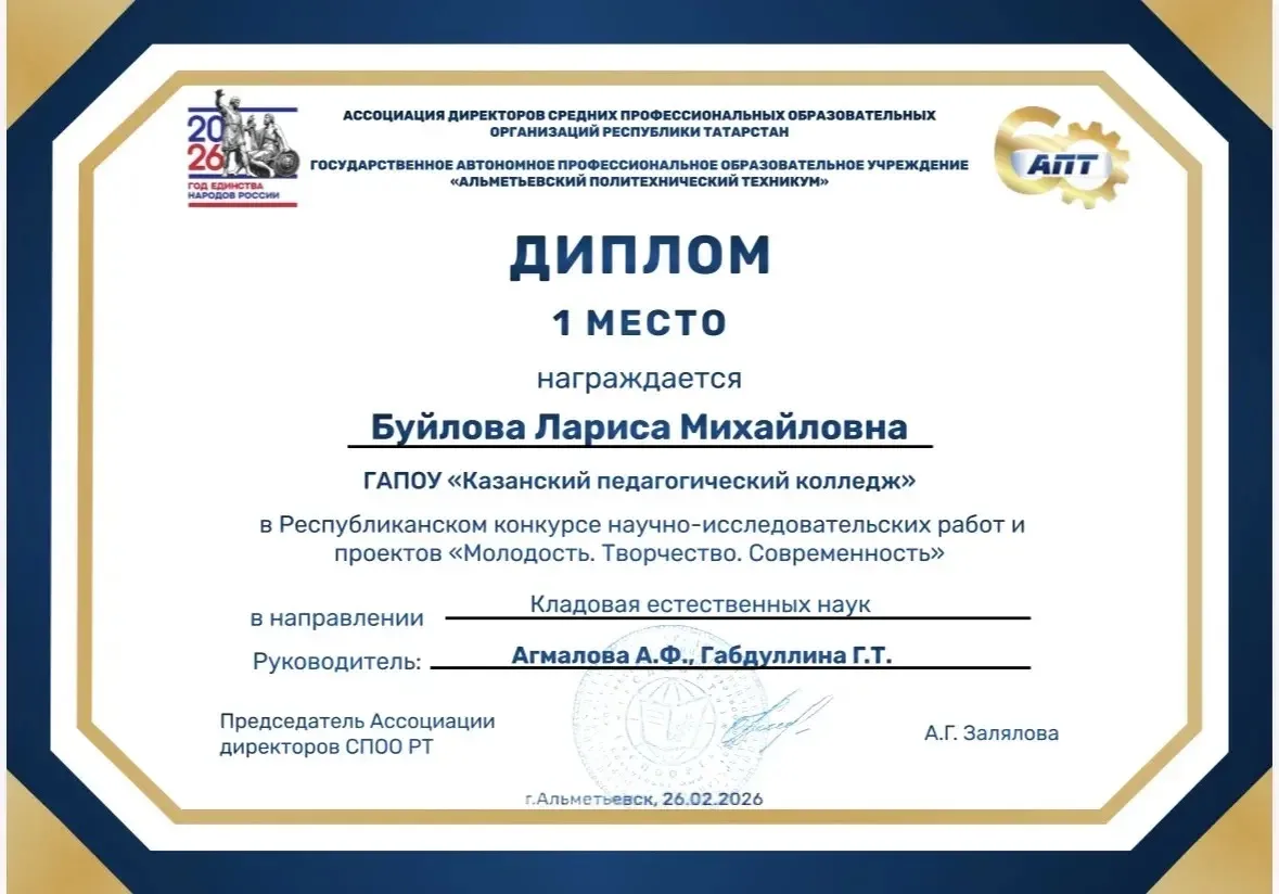 Опубликовано: 26.02.202626 февраля прошел очный этап Республиканского конкурса научно-исследовательских работ и проектов «Молодость.Творчество. Современность», где свой проект представила студентка 215 группы - Буйлова Лариса.