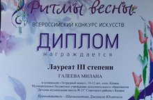 Поздравляем ученицу 5Б класса Галееву Милану, ставшую Лауреатом III степени в номинации "Эстрадный вокал", 10-12 лет, соло во Всероссийском конкурсе искусств "Ритмы весны". Поздравляем и желаем дальнейших творческих успехов!