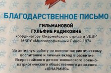 Поздравялем заместителя директора по воспитательной работе Гильманову Гульфию Радиковну, которая получила Благодарственное письмо за активную работу по военно-патриотическому воспитанию и личный вклад в развитие Всероссийского детско-юношеского военно-патриотического общественного днижения "ЮНАРМИЯ" (г.Москва). Очень гордимся и верим в высокие результаты лицея в сфере патриотического воспитания!