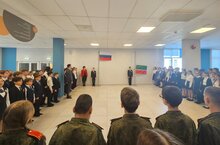 Государственный флаг РТ поднимал учащийся 6Б класса – Хайруллин Карим - отличник учёбы, призёр муниципального этапа по ОДНКНР. В остальных классах церемония проводилась в учебных кабинетах совместно с классными руководителями и учителями-предметниками.