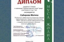 Поздравляем с победой нашу воспитанницу Сабирову Малику, с почетным дипломом лауреата 2 степени в IV Республиканском патриотическом конкурсе "Красная ромашка" среди детей дошкольного и школьного возраста, посвященный 120-летию со дня рождения Героя Советского Союза, поэта Мусы Джалиля и желаем нашей воспитаннице дальнейших успехов.