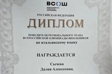 Поздравляем Сычеву Далию, ученицу 7м класса, с блестящей победой в Региональном этапе Всероссийской олимпиады по итальянскому языку.