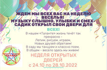 Приглашаем Вас на Неделю открытых дверей, которая будет проходить с 24 октября по 28 октября 2022 г. в нашем детском саду!
