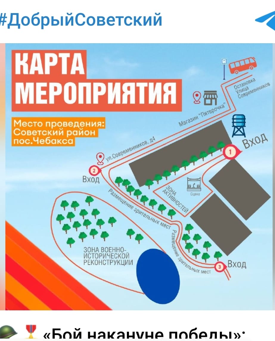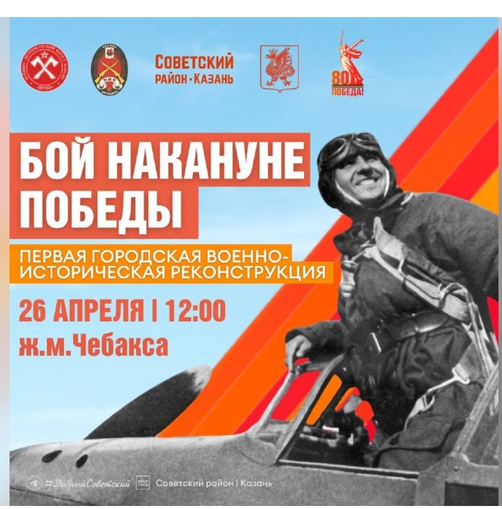 В субботу, 26 апреля, в поселке «Чебакса» пройдет масштабное и зрелищное событие, приуроченное к празднованию 80-летия Победы в Великой Отечественной войне — реконструкция реальных боев с участием пехоты, бронетехники и пиротехники. Начало в 12.00. ???? Также на площадке будут идти концерт, мастер-классы, можно попробовать настоящей полевой кухни, а для детей пройдет квест-игра и многое другое. Подробнее о событии — рассказали в карточках