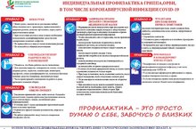 Памятка о коронавиросной инфекции, гриппе и ОРВИ 10.03.2020Индивидуальная профилактика гриппа, ОРВИ,в том числе коронавирусной инфекции COVID-19ПРАВИЛО 1. МОЕМ РУКИ Мойте руки с мылом после посещения любых общественных мест, транспорта, прикосновенийк дверным ручкам, деньгам, оргтехнике, перед едой и приготовлением пищи. При отсутствии доступа к воде и мылу необходимо использовать дезинфицирующие средстваили одноразовые влажные салфетки. Не прикасайтесь к лицу и глазам немытыми руками. Не пользуйтесь общими полотенцами.ПРАВИЛО 2. СОБЛЮДАЕМ ГИГИЕНУ РАБОЧЕГО МЕСТА И ПОМЕЩЕНИЙ Убедитесь, что Ваше рабочее место гигиенично. Для удаления вирусов с поверхности столов, стульев, дверных ручек, гаджетов, клавиатуры,мониторов, портфелей, сумок дезинфицируйте их, используя бытовые моющие средства (например,мыльный раствор). Часто проветривайте помещения на работе и дома, проводите влажную уборку.ПРАВИЛО 3. СОБЛЮДАЕМ ОБЩУЮ ГИГИЕНУ. Ежедневно принимайте душ, мойте волосы. Отдавайте предпочтение гладким прическам(распущенные волосы, часто контактируя с лицом, увеличивают риск инфицирования). В течение дня 3-4 раза промывайте проточной водой лицо и носовые проходы. Ограничьте приветственные рукопожатия, поцелуи и объятия. На работе принимайте пищу только в специально отведенных местах.ПРАВИЛО 4. ЗАЩИЩАЕМ ОРГАНЫ ДЫХАНИЯ С ПОМОЩЬЮ МЕДИЦИНСКОЙМАСКИ. Медицинские маски используются при посещении мест массового скопления людей, поездкахв общественном транспорте, при уходе за больными и при общении с лицами с острыми респираторнымивирусными инфекциями. Чтобы обезопасить себя от заражения, важно правильно носить маску:- маска должна тщательно закрепляться, плотно закрывать рот и нос, не оставляя зазоров;- влажную или отсыревшую маску следует сменить на новую;- маски следует менять каждые 2 часа;- при снятии старайтесь не касаться поверхностей маски руками;- использованная маска должна утилизироваться в мусорный контейнер;- не используйте вторично одноразовую маску. В случае отсутствия одноразовой маски, ее можно сшить несколько в домашних условиях из4 слоев марли. При уходе за больным, после окончания контакта, маску следует немедленно снять итщательно вымыть руки. Не рекомендуется использование маски на открытом воздухе. При чихании и кашле использованный тканевый носовой платок необходимо сразу менять,стирать ежедневно и проглаживать с обеих сторон. При возможности желательно использоватьбумажные носовые платки.ПРАВИЛО 5. ЧТО ДЕЛАЕМ ПРИ ПОЯВЛЕНИИ ПЕРВЫХ СИМПТОМОВ (высокаятемпература тела, озноб, головная боль, слабость, заложенность носа, кашель, затрудненное дыхание) Ограничьте контакты. Останьтесь дома и обратитесь в лечебное учреждение за медицинской помощью. Используйте для еды и питья индивидуальную посуду и мойте ее индивидуальной губкой смоющими средствами.ПРАВИЛО 6. ПРИ ВЫЕЗДАХ В КОМАНДИРОВКУ ИЛИ НА ОТДЫХВоздержитесь от поездок в зону риска по распространению вирусной инфекции, в том числекоронавирусной COVID-19.В случае выезда информируйте работодателя о стране, которую планируете посетить и сроках.В случае посещения страны зоны риска воздержитесь от контактов в течение 14 дней послевозвращения.ПРОФИЛАКТИКА – ЭТО ПРОСТО.ДУМАЮ О СЕБЕ, ЗАБОЧУСЬ О БЛИЗКИХ.