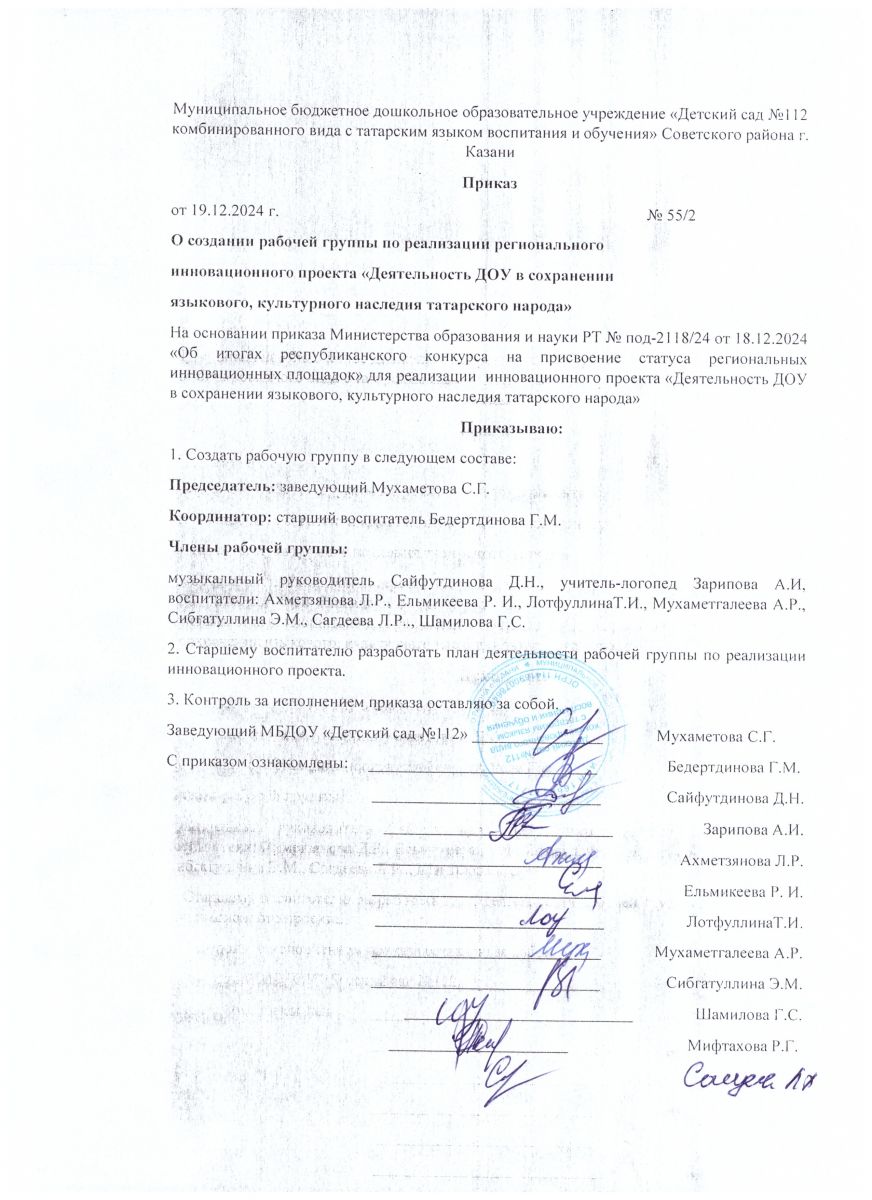 Приказ о создании рабочей группы по реализации регионального инновационного проекта.