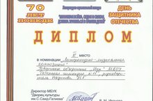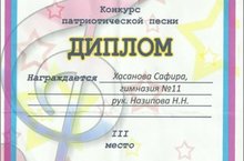 На прошедшем 19 февраля 2015г. в ДК.им.Саид-Галеева конкурсе патриотической песни, посвящённом 70-летию Победы "Шла с солдатом песня рядом" гимназию представляла ученица 3а класса Хасанова Сафира, которая награждена Дипломом. Подготовила ученицу учитель начальных классов Назипова Назия Габделнакиповна.