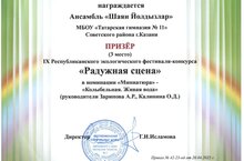 Ансамбль нашей гимназии "Шаян йолдызлар" стал призером IX Республиканского экологического фестиваля -конкурса "Радужная сцена" в номинации "Миниатюра"- "Колыбельная. Живая вода". Художественные руководители: Зарипова А.Р., Калинина О.Д.