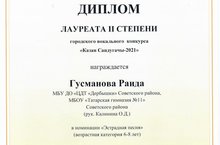 Поздравляем учащуюся 2 "Б" класса Гусманову Раиду с успешным выступленеием на городском вокальном конкурсе "Казан Сандугачы-2021". Раида стала лауреатом II степени.